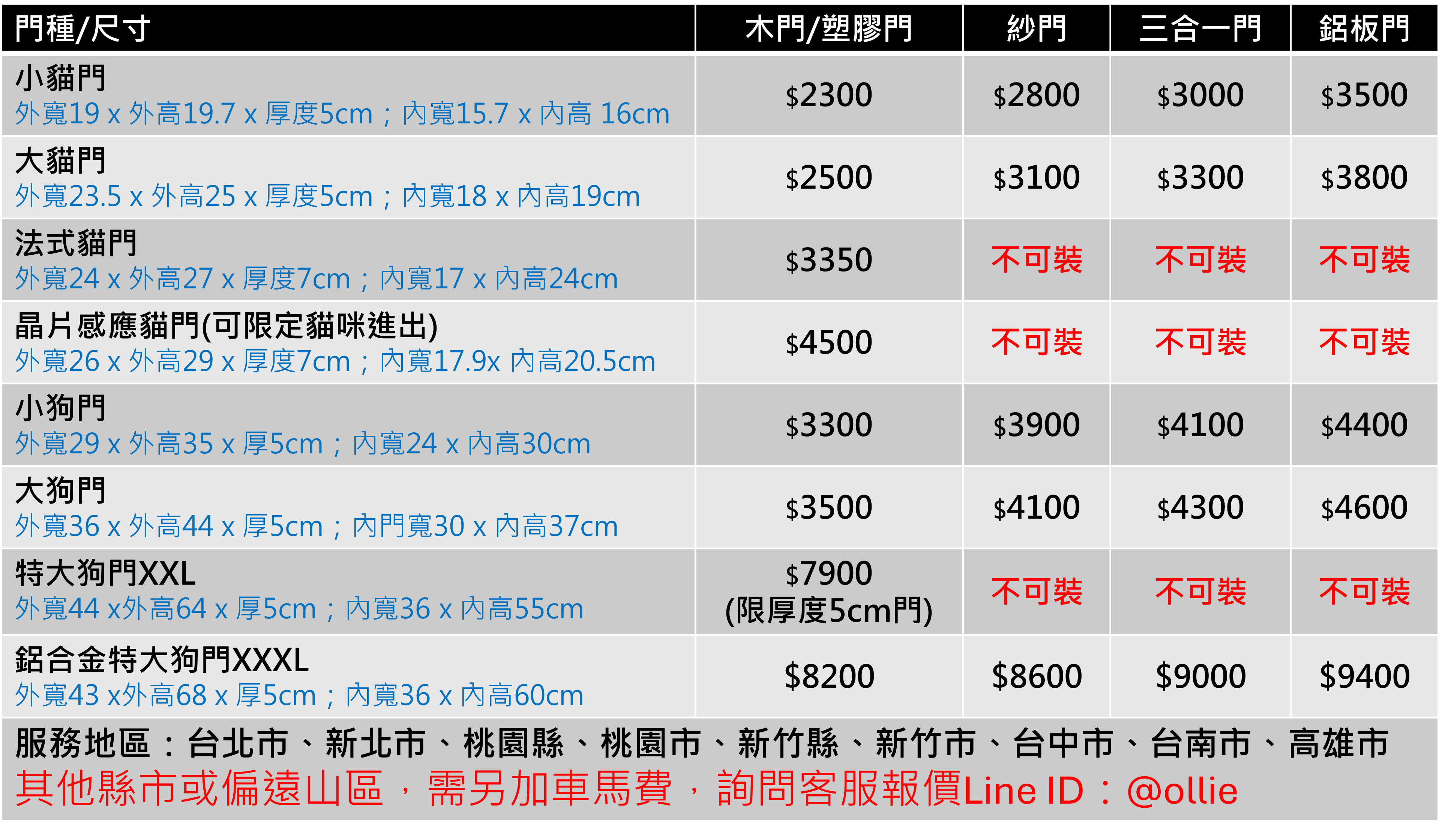 如需要到府安裝,在雙北、桃園、新竹、台中、台南、高雄,這些縣市我們可以3-5天內服務,連工帶料是$3320起,半圓形的貓門是比較難安裝,需要先看看木門的照片,請先傳要安裝的木門照片給👉客服