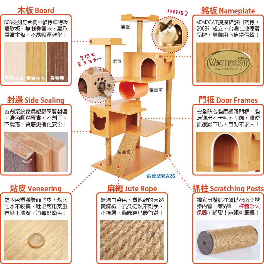 【內容物】抓柱(已纏麻繩)5根、木板3片、貓屋1個(已組裝完成,含大貓頭洞1個、大腳印洞1個)、貓盤1個、太空碗(直徑30cm)1個、螺絲1包、組裝說明書1份、木天蓼粉1包